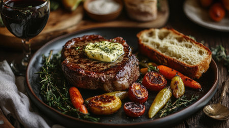 A mouthwatering steak topped with herb butter, surrounded by grilled vegetables and fresh bread, perfect for a gourmet meal or dinner gathering.