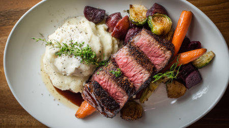 A gourmet steak dinner served on a modern plate, with slices of tender steak, roasted vegetables, and a dollop of creamy mashed potatoes.