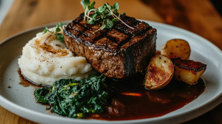 A beautifully plated grilled steak served with creamy mashed potatoes and saut