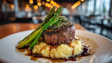 A beautifully presented gourmet steak dish featuring grilled asparagus and creamy mashed potatoes, perfect for food lovers seeking culinary excellence in a warm restaurant environment.