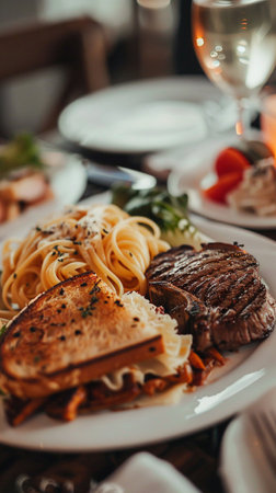 A sandwich on toasted bread, followed by pasta, steak, and a sweet dessert, makes for a full dining experience