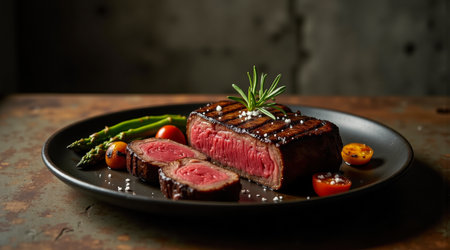 A mouthwatering steak garnished with fresh rosemary, served alongside grilled vegetables. Perfect for gourmet dining and culinary presentations.