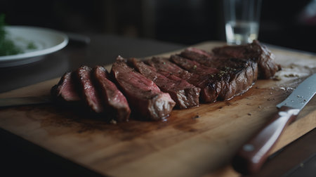 Sliced roast beef with spices and herbs on a cutting board. AI Generated.