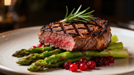 grilled beef steak with green asparagus and cranberry sauce