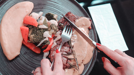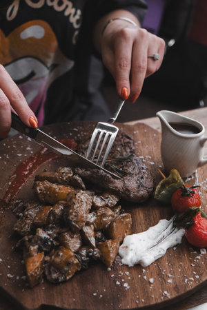 Female having a steak in the restaurant close up