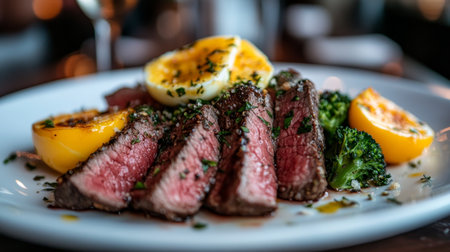 Sliced Steak and Eggs with Lemon and Broccoli on a White Plate A Gourmet Culinary Delight
