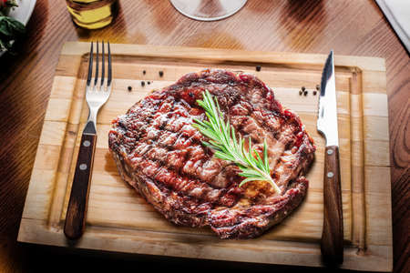 Grilled beef steak on a wooden cutting board with knife and fork