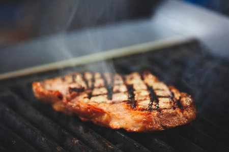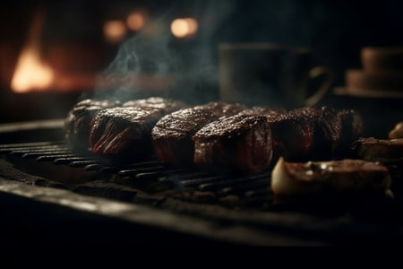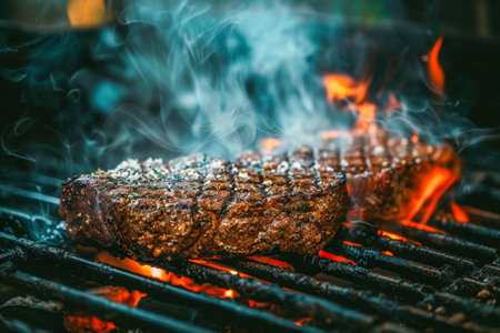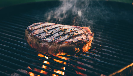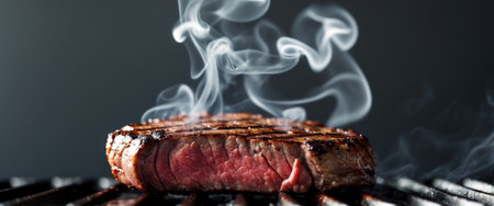 A mouthwatering steak sizzling on a grill, producing delicious smoke and flavor. Ideal for culinary-related projects or food promotions.