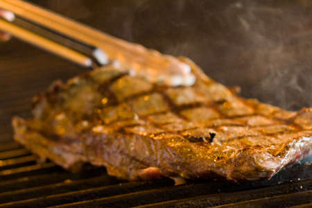 Frying process of striploin steak. Piece of medium rare piece of meat on grill frying pan in flames being turned over with metal cooking tongs. High quality photo