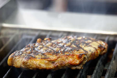 Step by step. Grilling New York strip steak on outdoor gas grill.