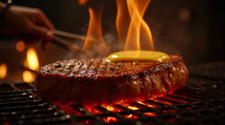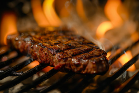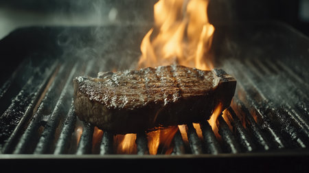 A dramatic shot of a sizzling steak being flipped on a hot grill, with flames and smoke adding excitement to the cooking process, capturing the essence of grilling