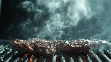 Photorealistic close-up of smoke rising from a grill, showcasing sizzling meat in warm, cinematic tones. The horizontal framing captures the essence of outdoor cooking.