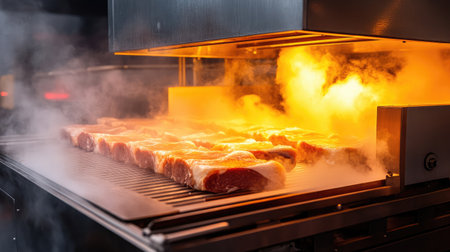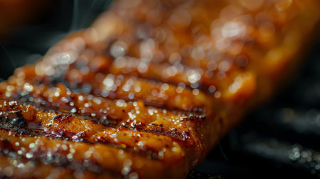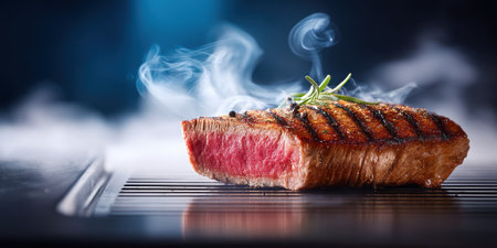 close-up of wagyu steak with grill marks and smoke rising from the surface, created with generative ai