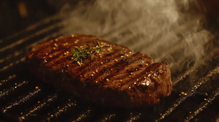 A close-up of a juicy steak on a sizzling hot grill, with beautiful grill marks and a hint of smoky char, ready to be served with a side of herbs and spices.