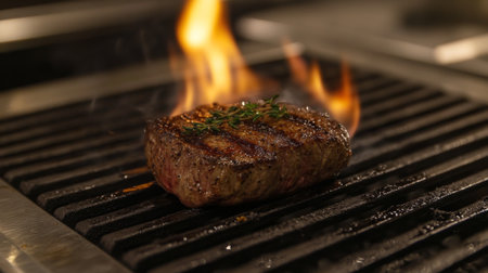 A perfectly grilled steak with flames and herbs showcases the art of cooking in a professional kitchen. Ideal for food enthusiasts and chefs.