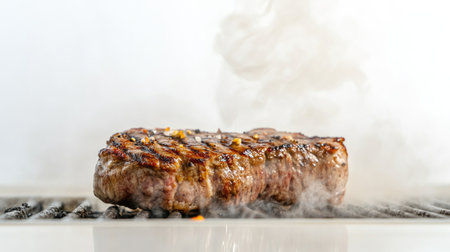 A juicy grilled steak emits smoky vapor, highlighting its perfect char and irresistible flavor. Ideal for food photography and culinary inspiration.