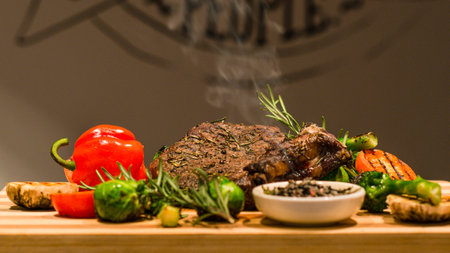 A mouthwatering steak garnished with fresh rosemary, served alongside grilled vegetables. Perfect for gourmet dining and culinary presentations.