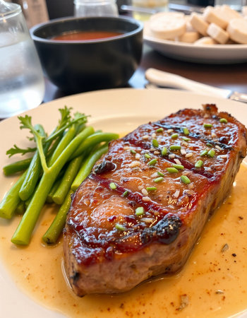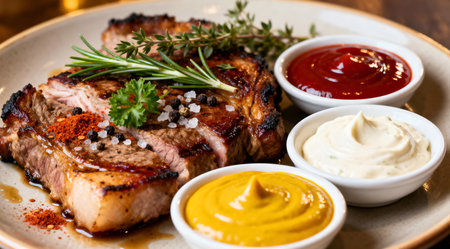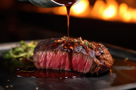 close-up of grilled steak, drizzled with savory sauce, created with generative ai
