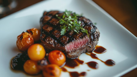 A New York strip steak, grilled to perfection, served on a white plate with roasted cherry tomatoes and a drizzle of sauce