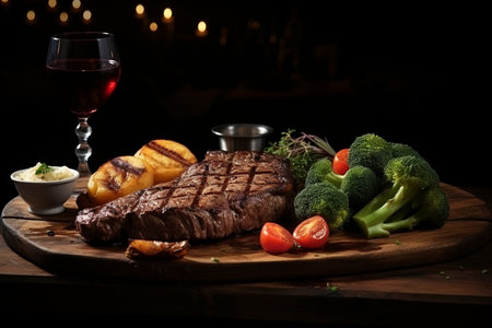 flicker of flames around steak mopped with red wine reduction, created with generative ai