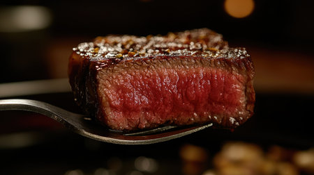 Food A steak rests on a fork, ready to be enjoyed as part of a delicious dish