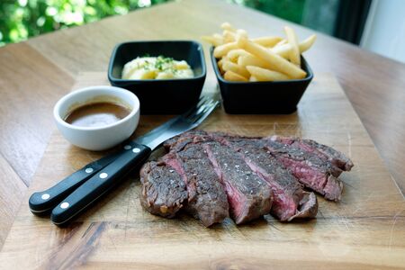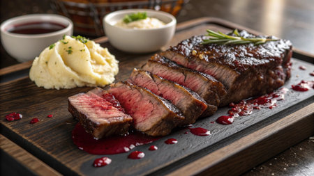 Grilled beef steak with sauce and mashed potatoes on a wooden board
