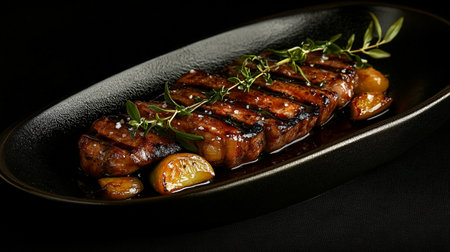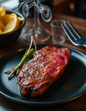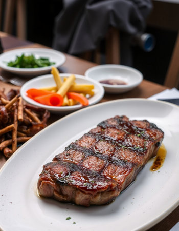 A beautifully cooked grilled steak served on a plate, showcasing juicy texture and rich flavor. Ideal for gourmet meal inspiration or restaurant menus.