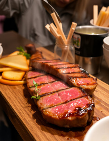 Grilled picanha at the point, served in a sophisticated restaurant with art on the walls., generative AI