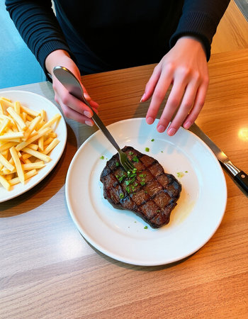 A close-up view displays a grilled steak, fries, and broccoli on a white plate with a sauce. The food is arranged neatly, with a rich color palette. The composition has soft lighting that suggests an indoor setting. This image could be used for culinary, restaurant, or food-related marketing material.