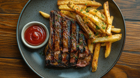 A beautifully arranged plate featuring grilled steak with crispy fries and rich sauce, perfect for culinary enthusiasts and restaurant promotions.