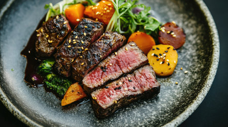 An exquisite grilled steak dish featuring tender cuts served with creamy mashed potatoes and colorful vegetables, ideal for food enthusiasts and culinary showcases.
