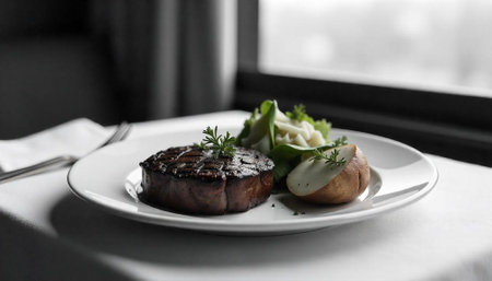 A steak dinner set with grilled vegetables and a baked potato, served on a elegant plate for a luxurious dining experience.