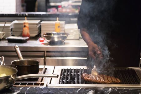 Grilled beef steak with potatoes and tomatoes on a plate in a luxurious restaurant with a luxurious bistro interior.