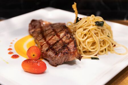 Medium grilled striploin beef steak with spaghetti olio a side dish served on white dish.