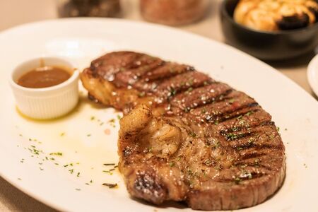 Medium grilled strip loin beef steak with pepper sauce in warm light at restaurant.