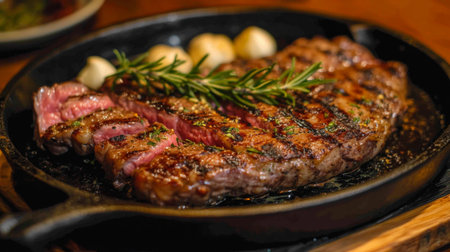 A mouthwatering grilled steak served on a cast iron plate, garnished with fresh rosemary. Perfect for food lovers and gourmet enthusiasts.