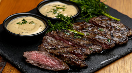 A beautifully grilled steak served with two creamy dipping sauces, garnished with fresh herbs on a black slate platter, perfect for food lovers.
