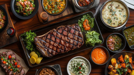 A mouth-watering display of grilled meats and vibrant side dishes, perfect for food lovers. This colorful assortment showcases exquisite flavors and culinary art.