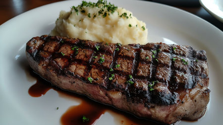 A beautifully plated grilled steak served with creamy mashed potatoes and saut