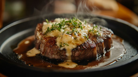 A succulent grilled steak topped with melting butter and herbs, served on a sizzling hot plate. Perfect for gourmet meals or special occasions.