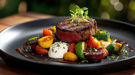 This image showcases a beautifully grilled steak served with vibrant vegetables and herbs, highlighting a blend of flavors and culinary artistry.