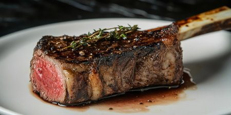 Close up steak photo with crispy crust juicy center herb butter and charred sides for culinary use