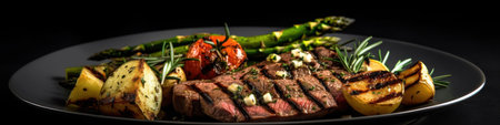 Beef steak with vegetables and sauce on a black background. Restaurant
