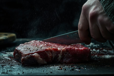 A chef slices juicy grilled steak on a wooden board, showcasing its tender texture and smoky flavor, perfect for culinary enthusiasts.