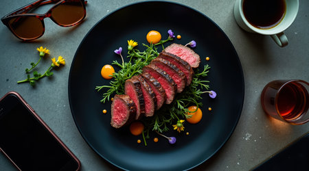 AI Generated. A succulent steak served on a black slate plate emphasizing its juicy texture and flavorful seasoning