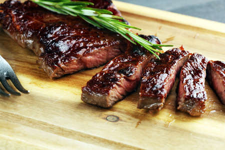 Grilled beef steak with with rosemary, spices and salt on cutting board. Selective focus