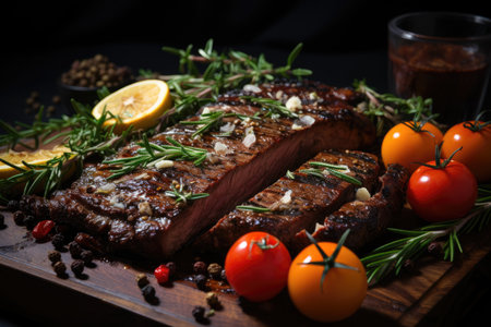 AI Generated. Juicy Grilled Steak on Wooden Cutting Board with Rosemary