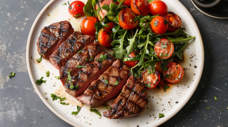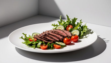 AI Generated. Grilled beef steak slices with fresh salad served on a plate