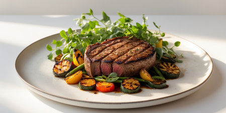 gourmet food presentation, quality dining presentation: a succulent grilled steak paired with roasted vegetables on a white plate highlights the significance of superior food standards