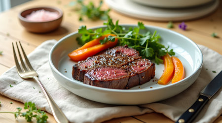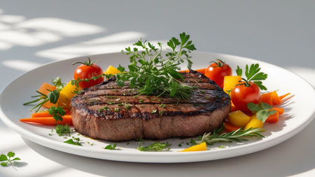AI Generated. Grilled Steak with Fresh Herbs and Colorful Vegetables on Plate